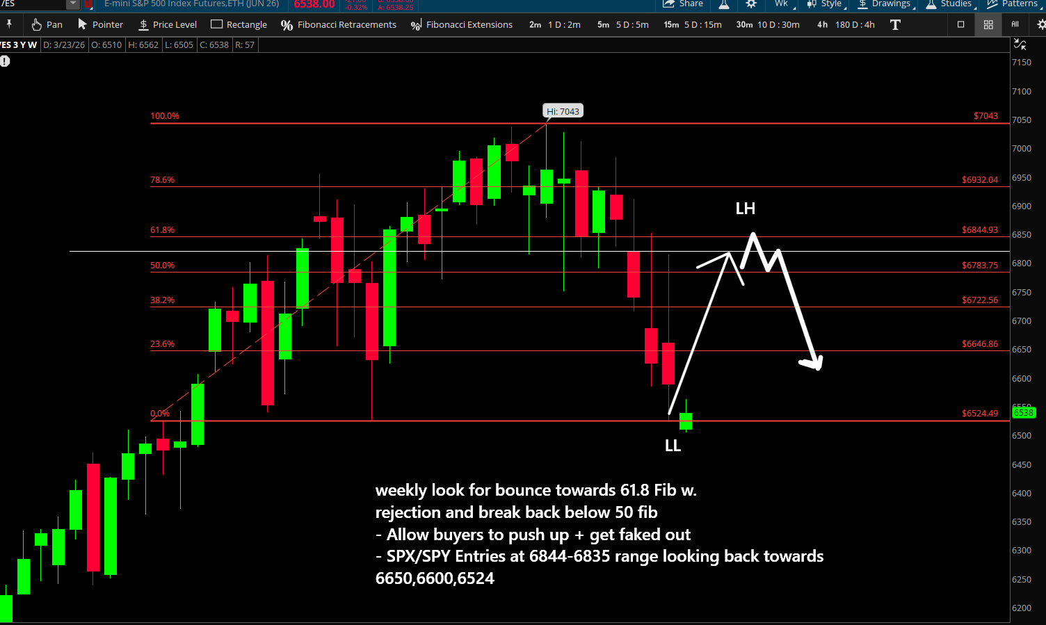 Why: This aligns with the Weekly trend shift. Shorting the 61.8% retest after a 200 SMA break is the highest-probability entry for the next move to 6400.