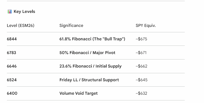 On /ESM26, we printed a Lower Low (LL) at 6524 on Friday. The current sentiment is "Maximum Fear" due to crude oil holding $90+ and rates screaming higher. However, SPY is sitting near its weekly expected move lower bound (644-645), suggesting a short-term "rubber band" snap-back is overdue.
