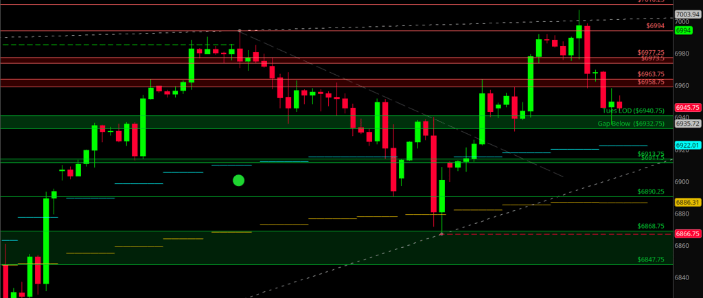 Price failed to hold above the 6,957–6,963 high — a key area that rejected on Tuesday and gave back momentum. That failure keeps risk elevated near highs and puts the focus back on reaction, not prediction.