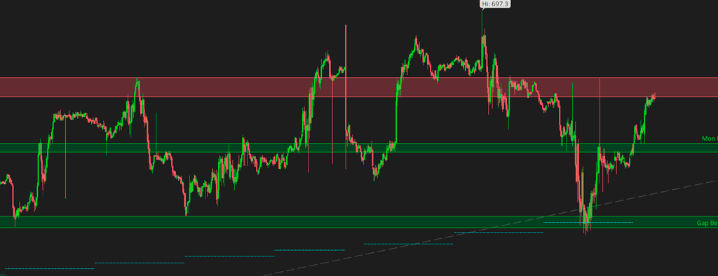 We are now up into the supply at 694. Will need to see a hold above that for upside. Cautious of how much we're gapped up.