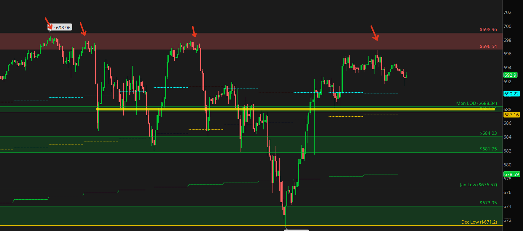 Being long with the SPY just sitting right below this major ATH... not much risk/reward. Not much run way to make a nice move. I would much prefer we get a pullback to setup a nice pullback long. I like a pullback towards the 20DMA or deeper at the 688 Monday low & 50DMA.