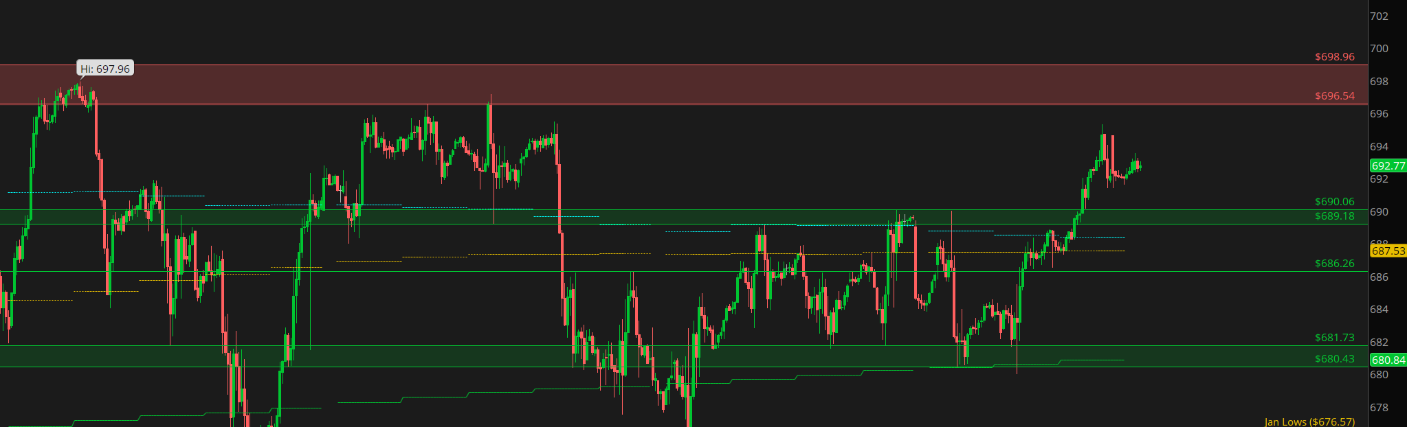 The 696.50/698 zone above will be tough. Would prefer to have a lower entry before heading towards those highs.