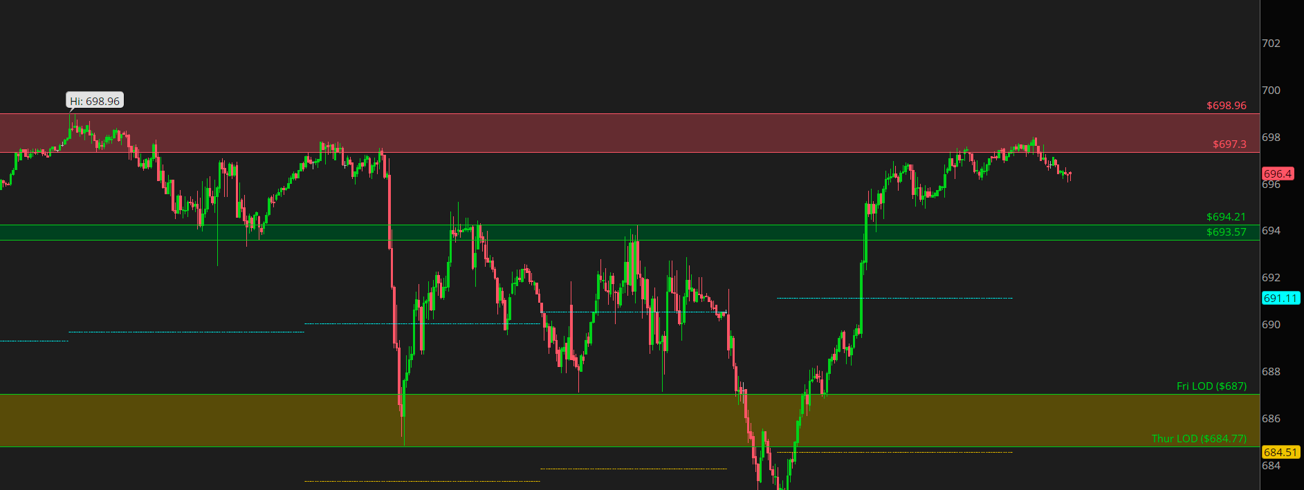 This 694 pullback is the money spot today. Would be awesome to see a clean retest long setup there. Below 694, we need to be looking for the pullback to the 20DMA. That will be an interesting spot as well.