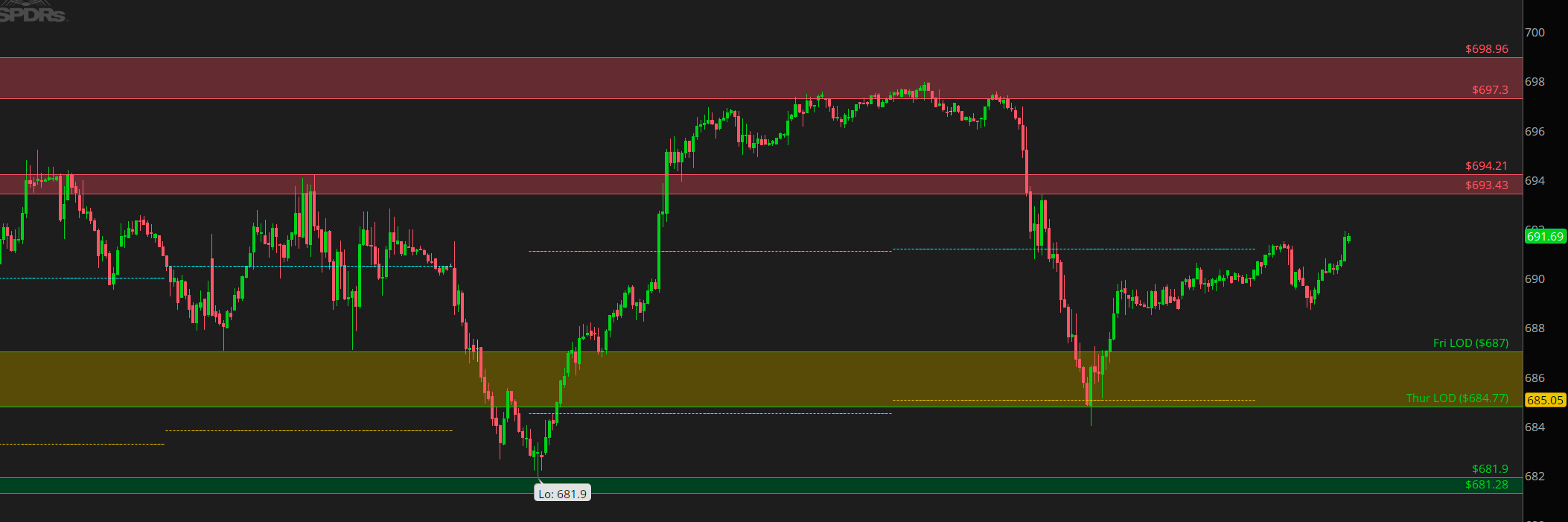 Holding this area again... 50DMA also stepping up down there. Tough spot to break below for now. I would be interested to see what happens as we trade higher into the Friday high & the intra-day rejection spot between 693.43/694.21.
