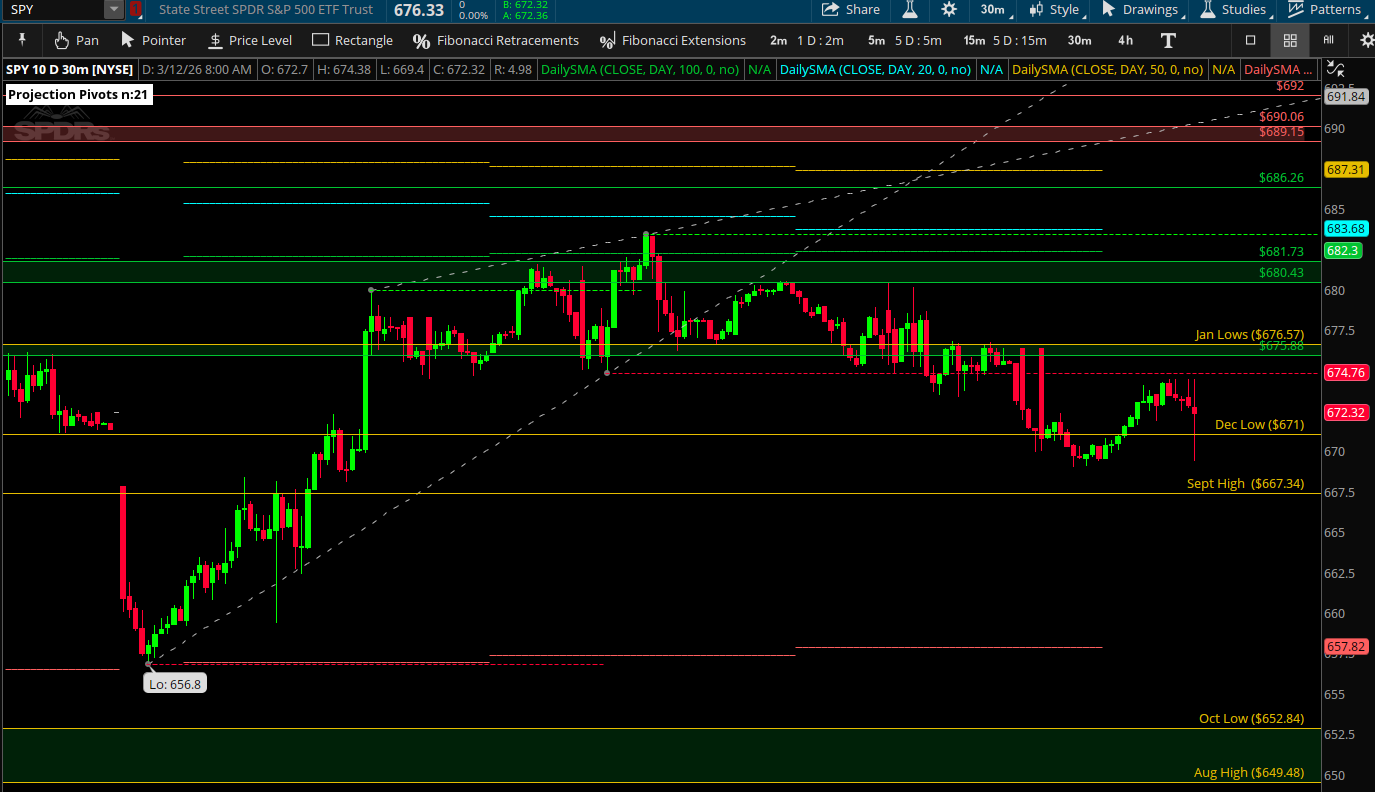 Potential lower highs between 674.76/676.11. Need to see us reclaim those Fri highs from last week. If we can, back towards the 20DMA is possible.