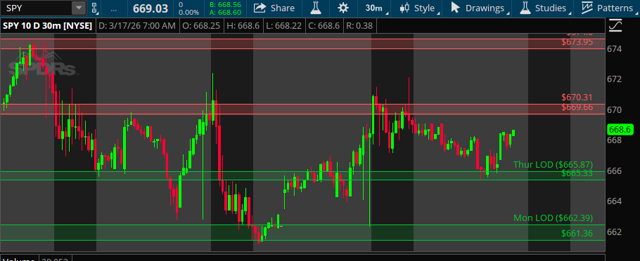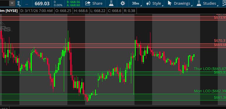 We need to clear the 670/671.30 highs. We need to see holds above Fri/Mon highs. If we get that, upside continuation is possible into 674. Above 674, more freedom towards 680. Let's see if Thur LOD holds strong at 665.