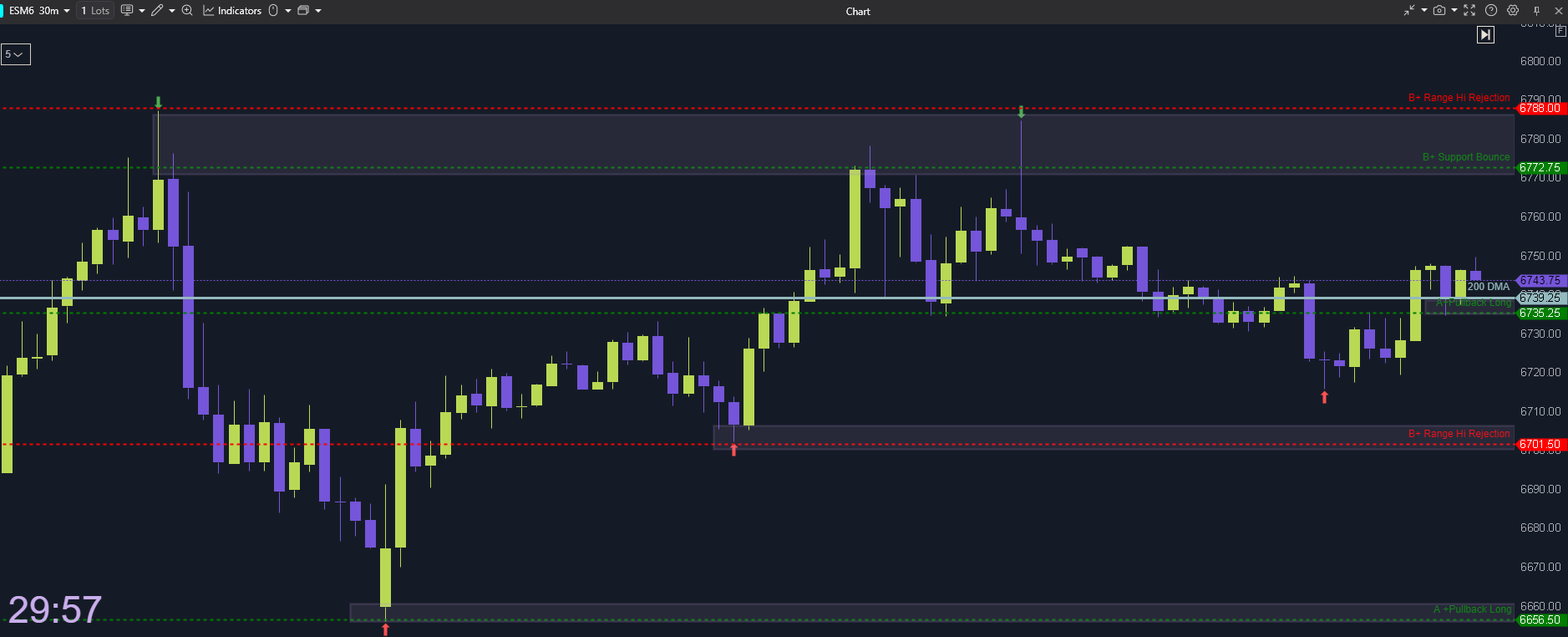 We’re essentially in the same position as yesterday — price is stuck within range and sitting right on the 200DMA (~6,739).