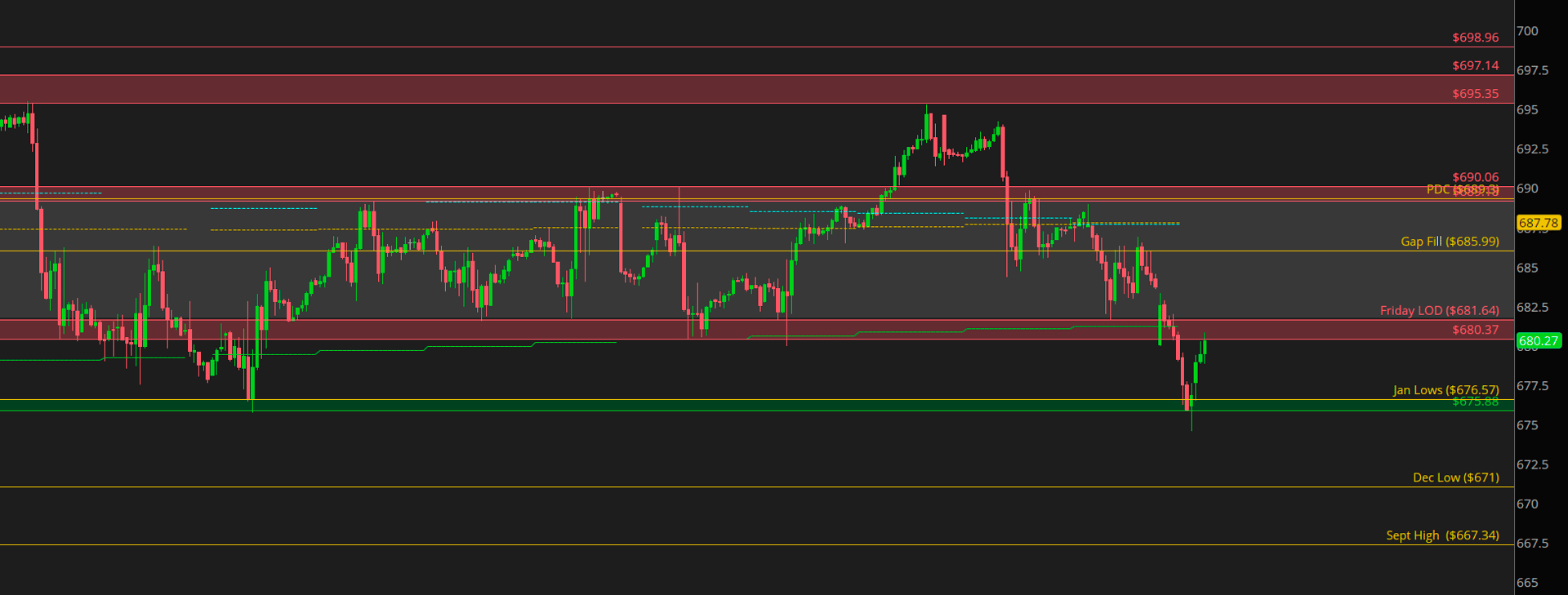 The cleanest trade here would be a retest rejection of the Friday LOD at 681.64. This would be a really nice rejection, also off the daily 100 SMA. This looks like the best trade of the day, in my opinion. If we do reclaim Friday LOD, then we would likely gap fill up towards 686. The downside target would be back into the January lows at 676.57. Below 676, it looks like we could trade lower to the December low at 671.