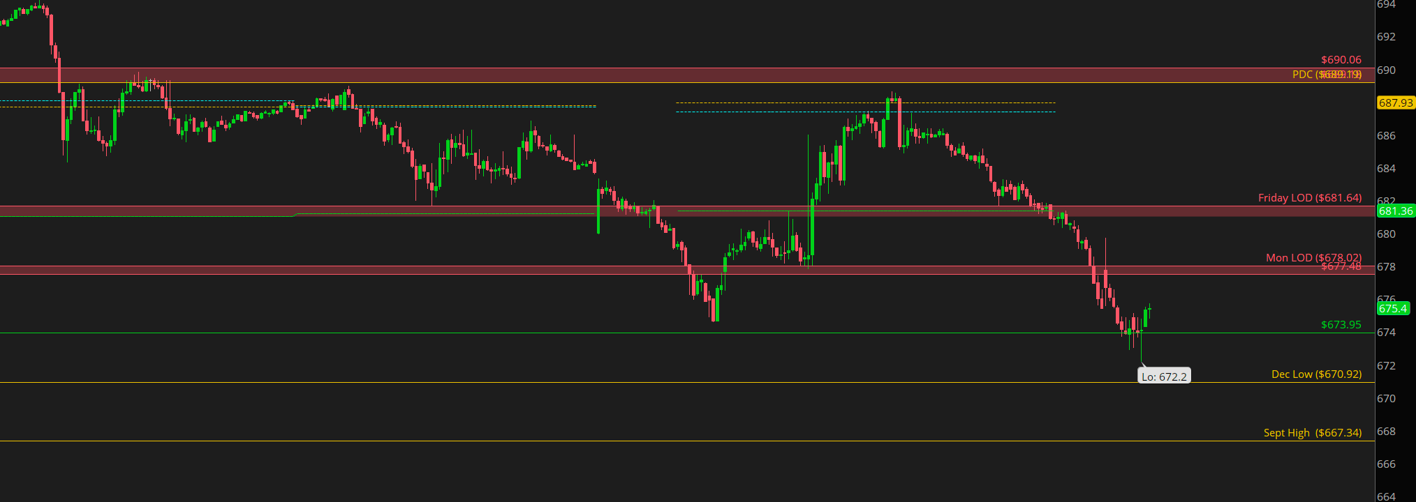 You have some very important demand between 671 and 674. I would first look for a move higher towards Monday LOD or Friday LOD for a lower high rejection today. If we reclaim Friday LOD and the 100 DMA, then we can look for longs once again just like yesterday.