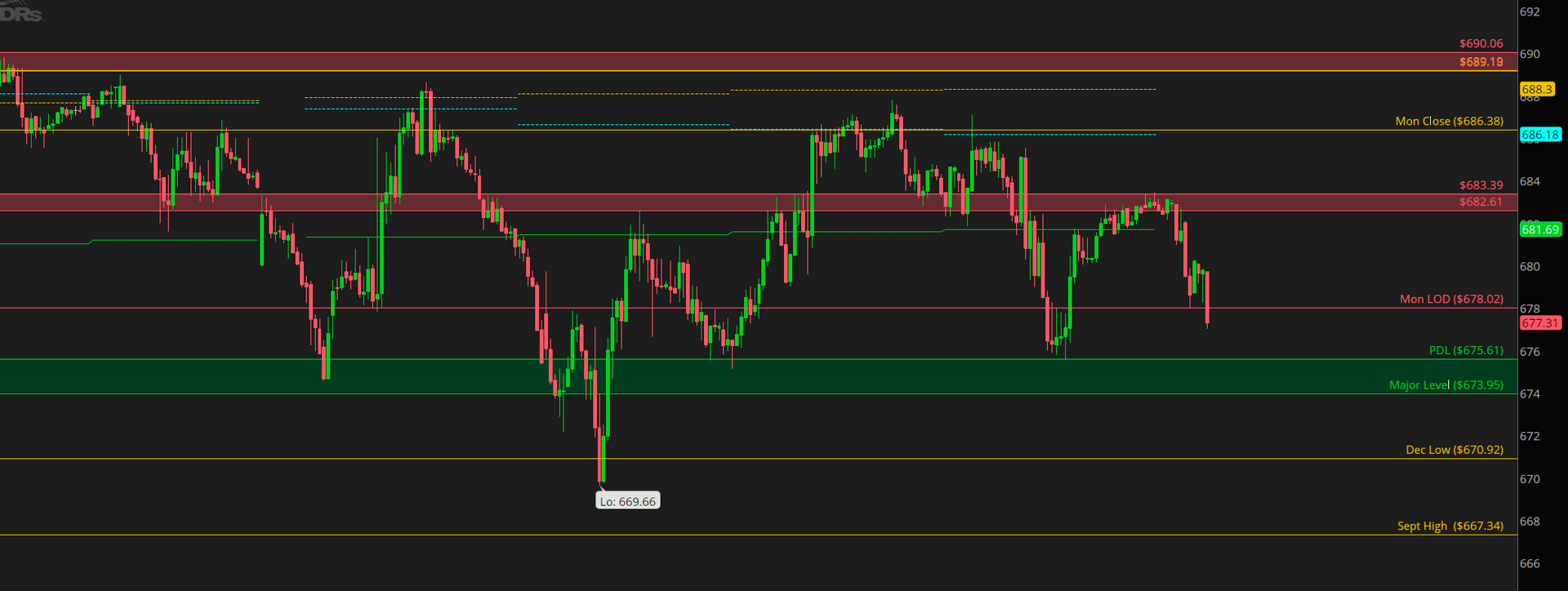 Very clean rejection of the 100 DMA and 683. Looking for downside continuation today if we can fail below 674. Very major level 674 on the SPY. Would not want to be too aggressive short into it, but if we can fail below 674, we should get downside continuation quite aggressively. Cautious of the bounce off PDL and cautious of the channel between yesterday's price action.