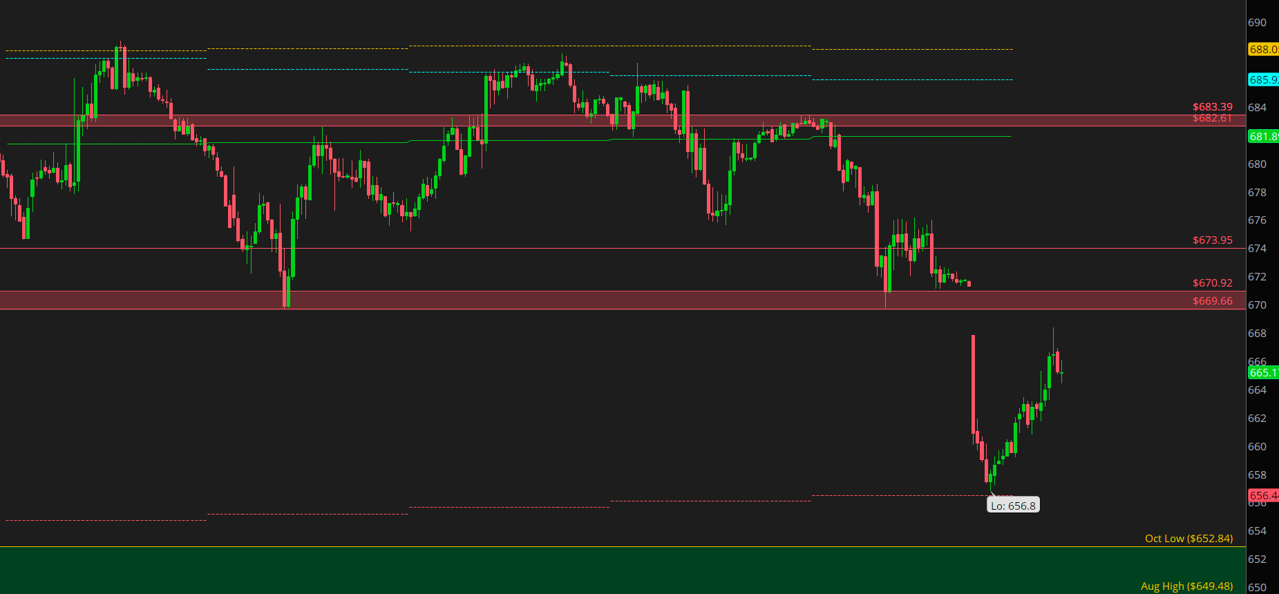 Very clean rejection of the 100 DMA and 683. Looking for downside continuation today if we can fail below 674. Very major level 674 on the SPY. Would not want to be too aggressive short into it, but if we can fail below 674, we should get downside continuation quite aggressively. Cautious of the bounce off PDL and cautious of the channel between yesterday's price action.